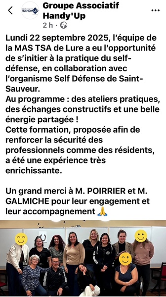 Initiation Self Defense/Auto Defense avec travail adapté pour le personnel de l' Adapei Résidence 70 ( HANDYUP ) de Vesoul , merci à Marc pour l'initiative et l'accueil , à la directrice Madame SADAOUI Wouidesse pour avoir validée cette journée , et aux participants (es) pour leur implication et les échanges précieux .